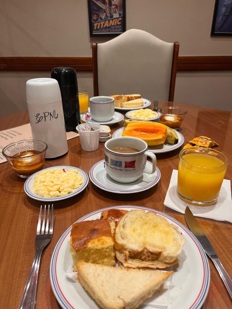 Ovos mexidos, torradas, lanchinhos, frutas, bolos, docinhos, salgados, suco de laranja, café, leite quente, geléia e manteiga.